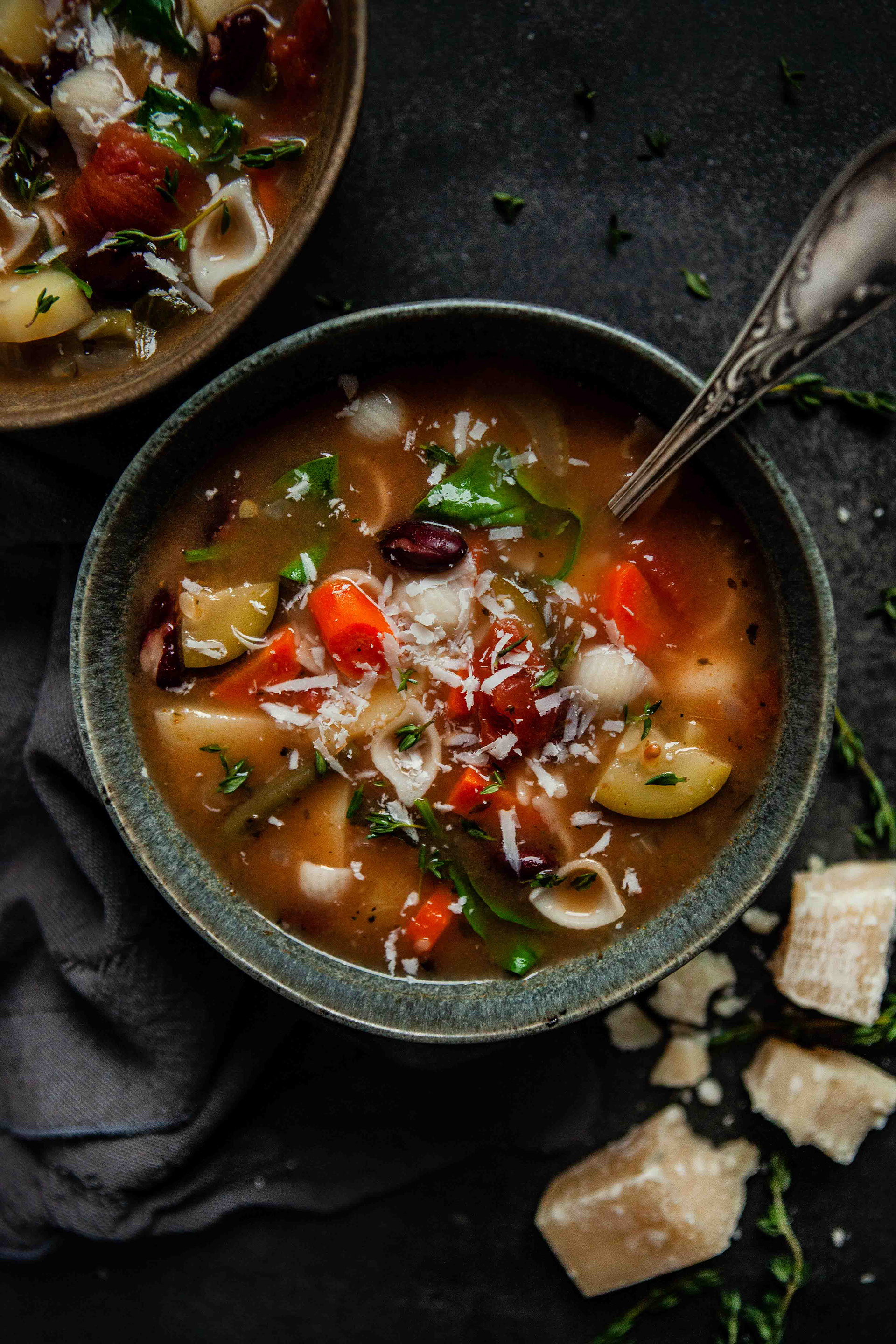 Classic Minestrone Soup captured in a dark mood. The vibrant colors of the vegetables stand out against the dark neutrals creating atmosphere of reserved elegance. Contact me if you need professional photos of social media.