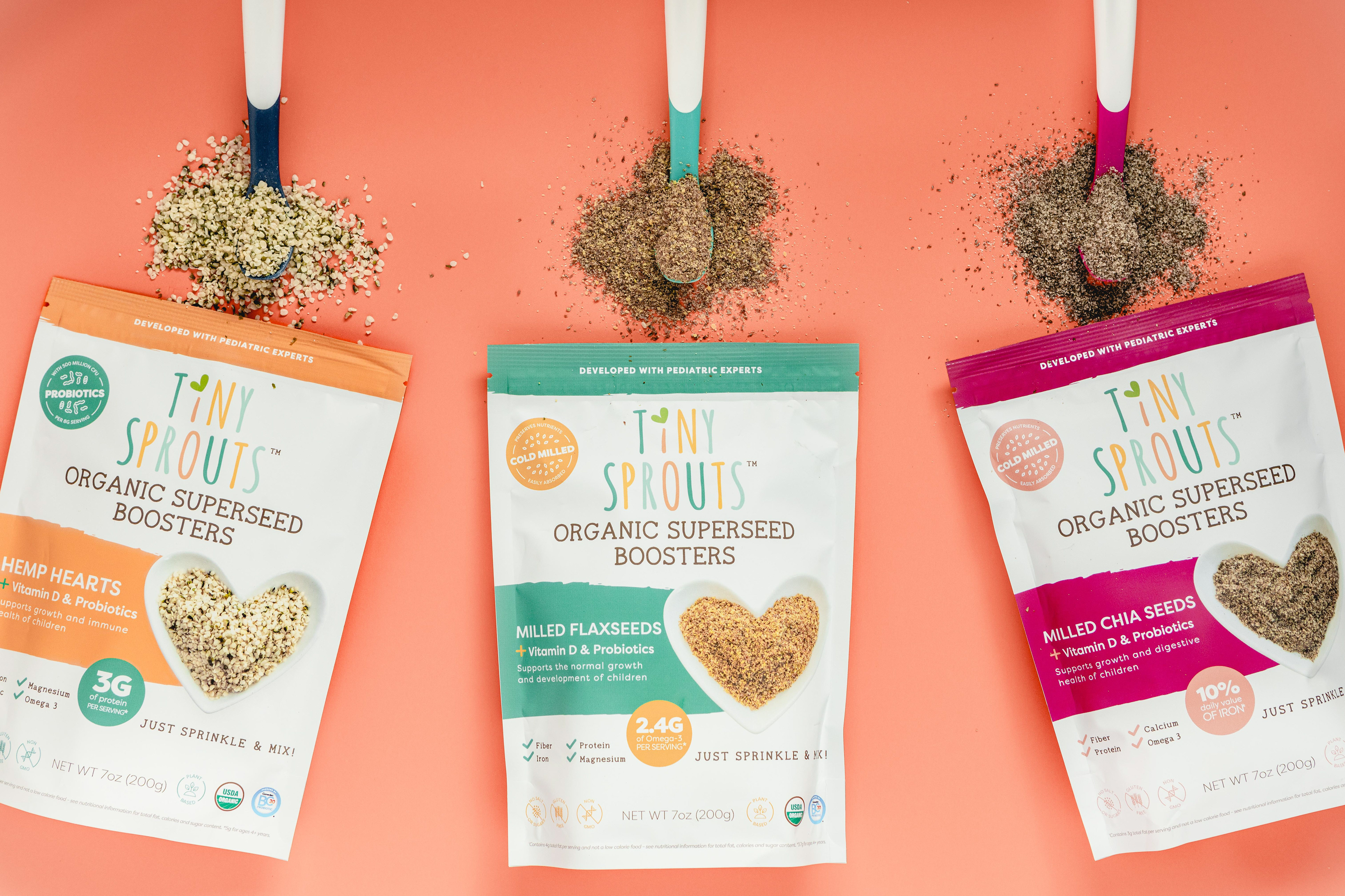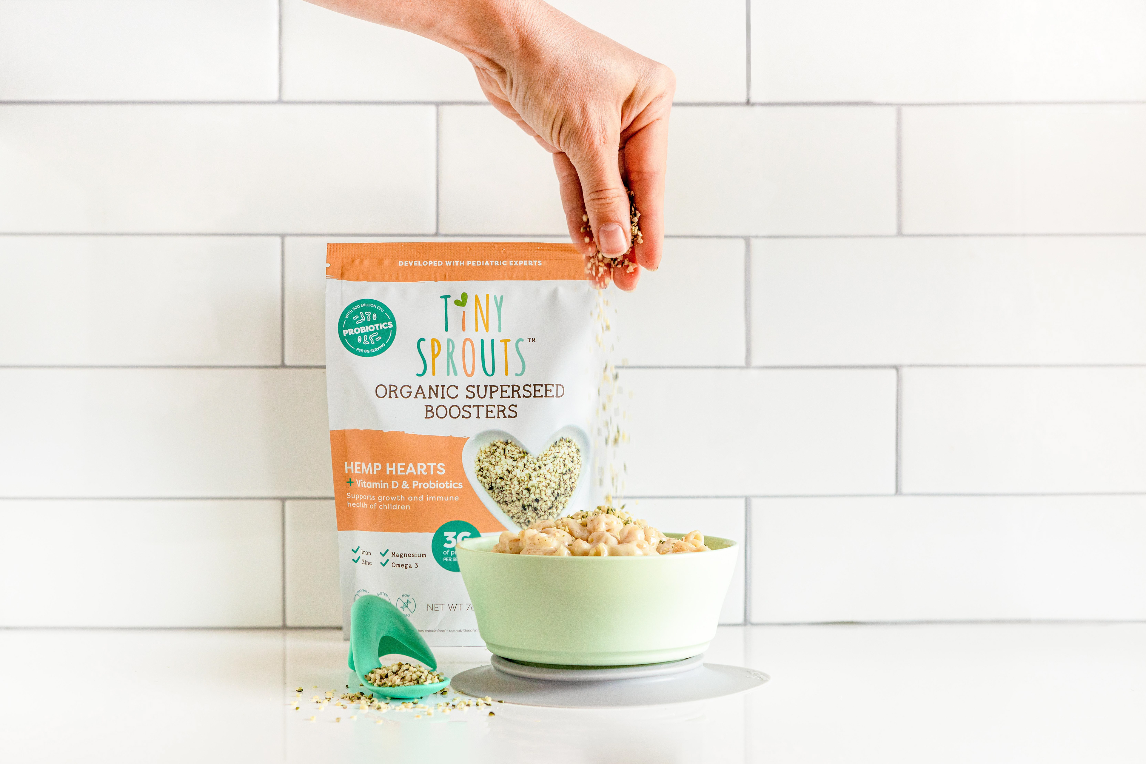 Below is a series of images shot for Tiny Sprouts, a brand of kids' superseed boosters that promote healthy growth and development. They had a very clear vision as to what they wanted their "brand look" to be. Their desired aesthetic is bright, minimal, with a little haze to it. I had a lot of fun delivering on that concept - and the clients loved it!